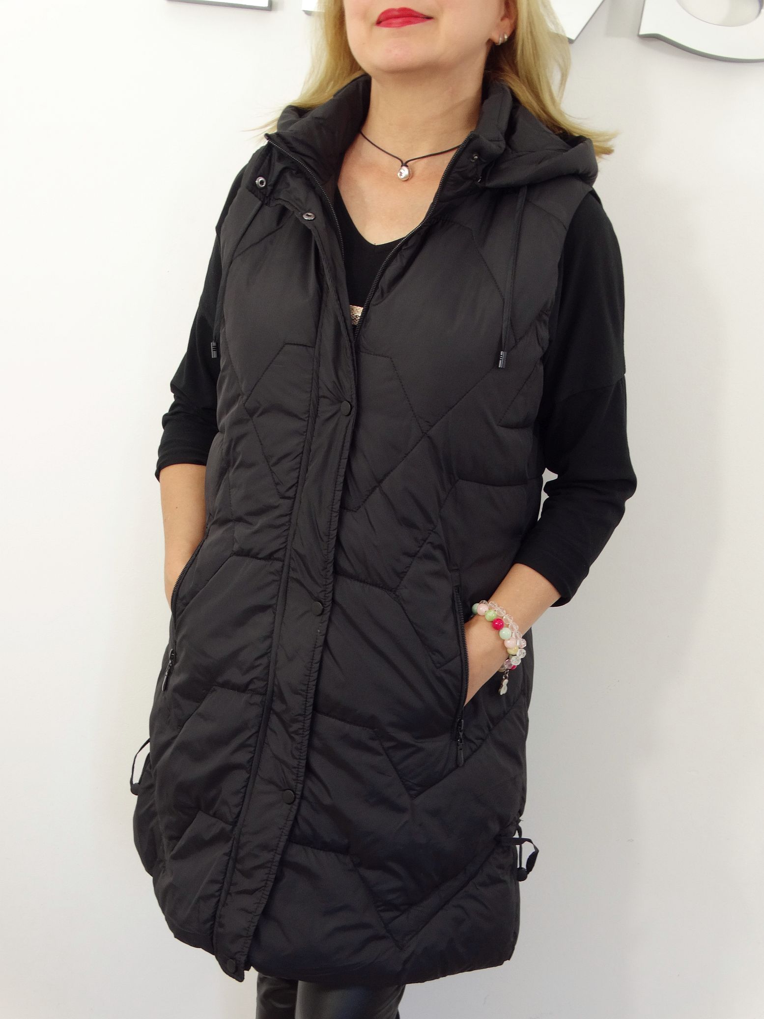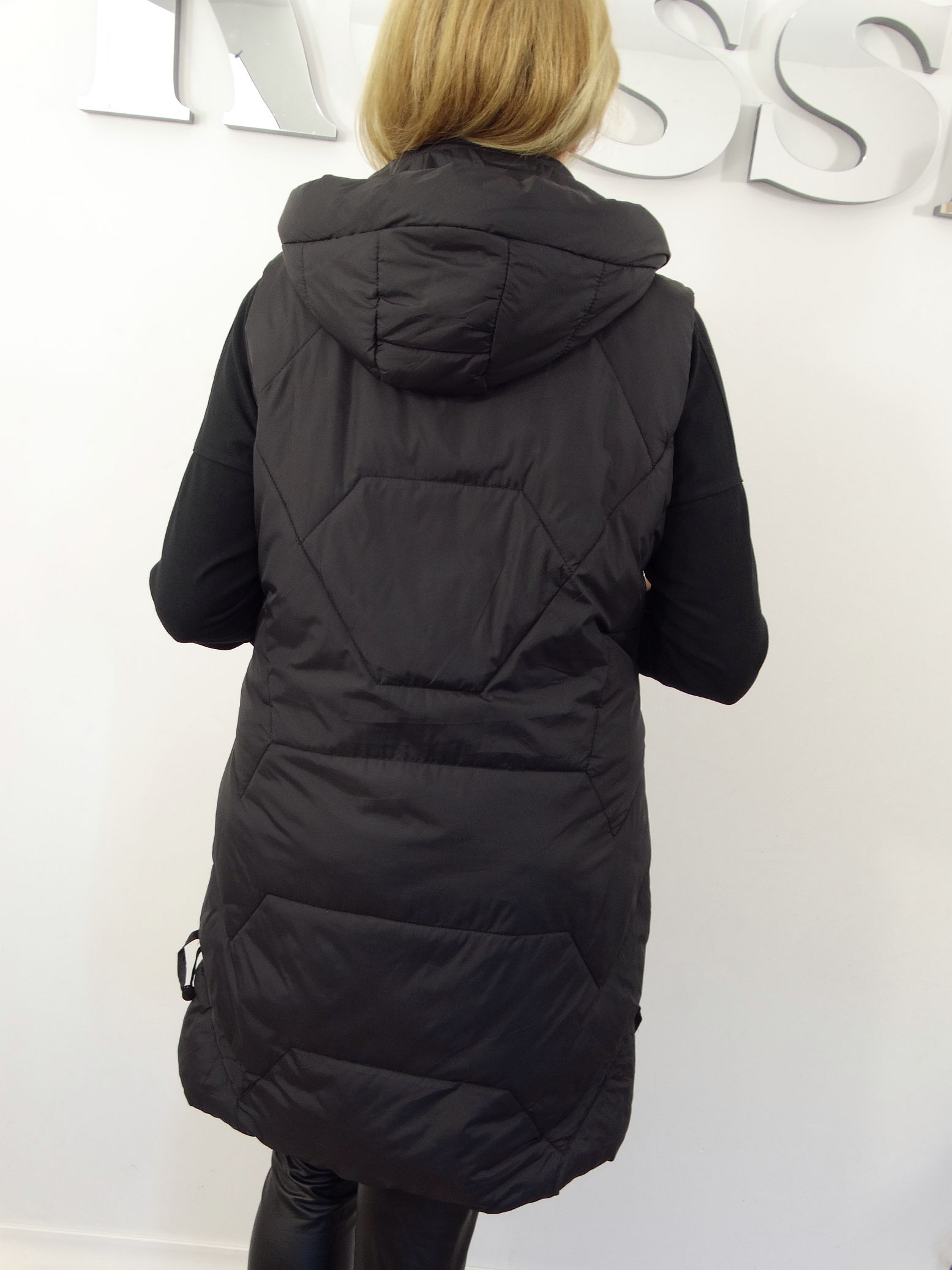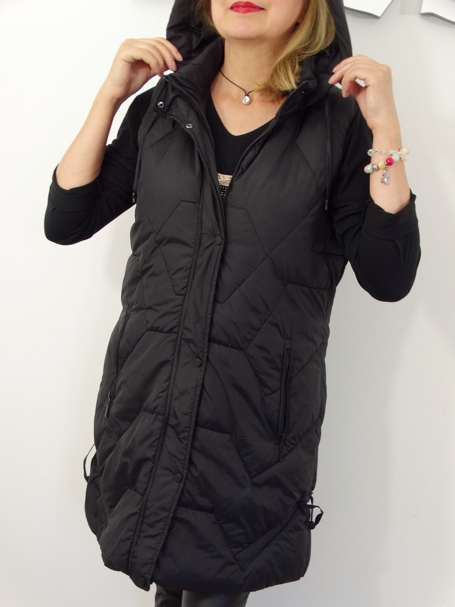 Długa Kamizelka Pikowana Bezrękawnik z Odpinanym Kapturem SIMONA od 44 do 54 czarna