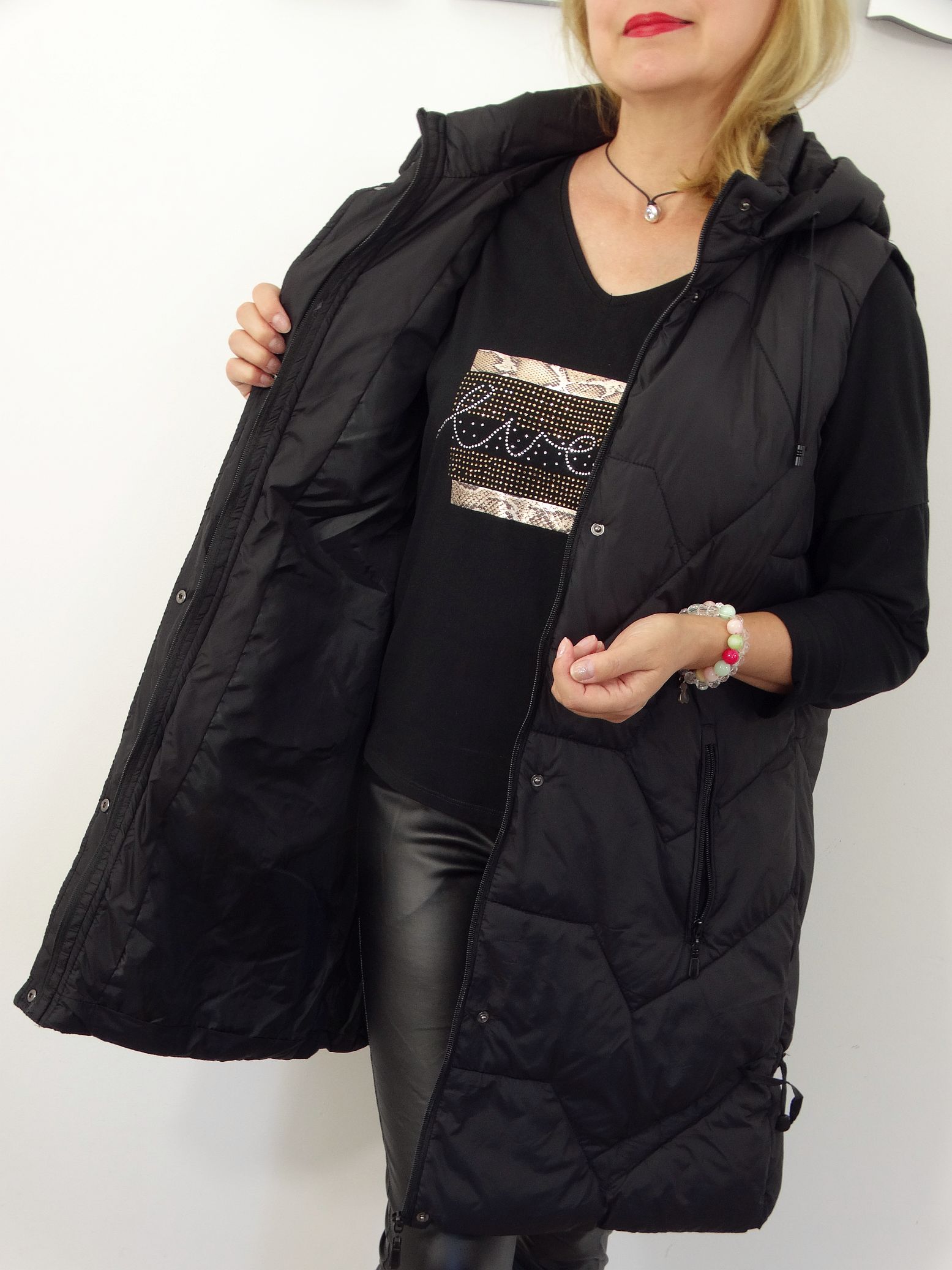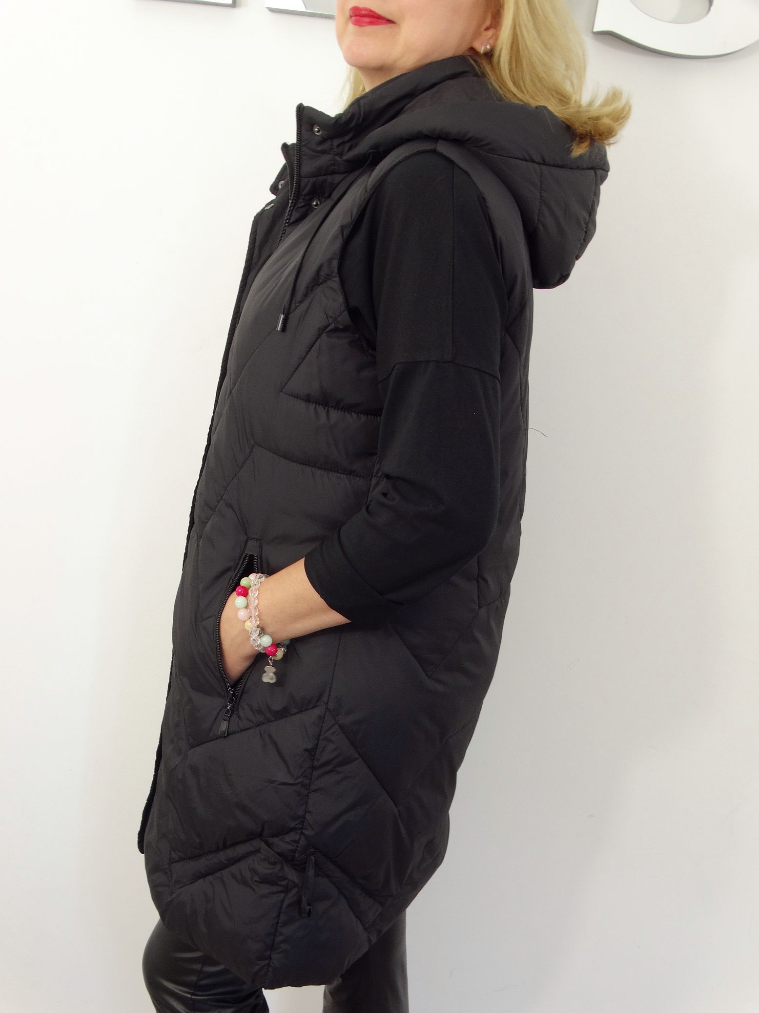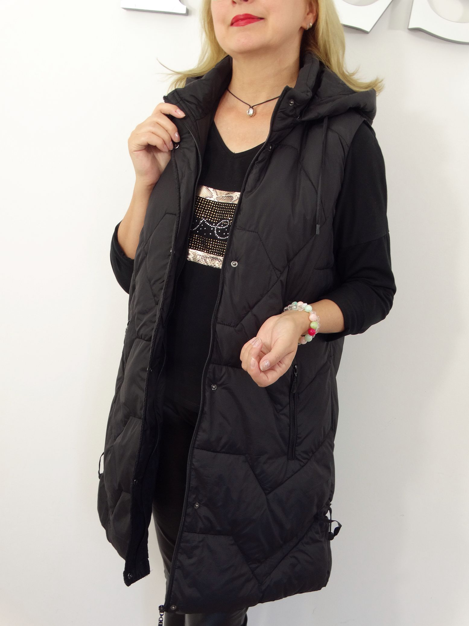Długa Kamizelka Pikowana Bezrękawnik z Odpinanym Kapturem SIMONA od 44 do 54 czarna