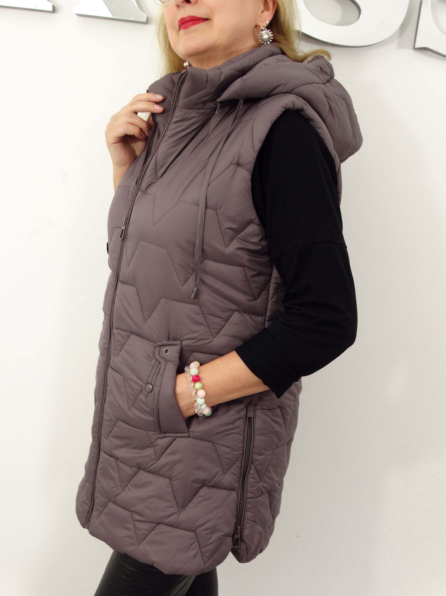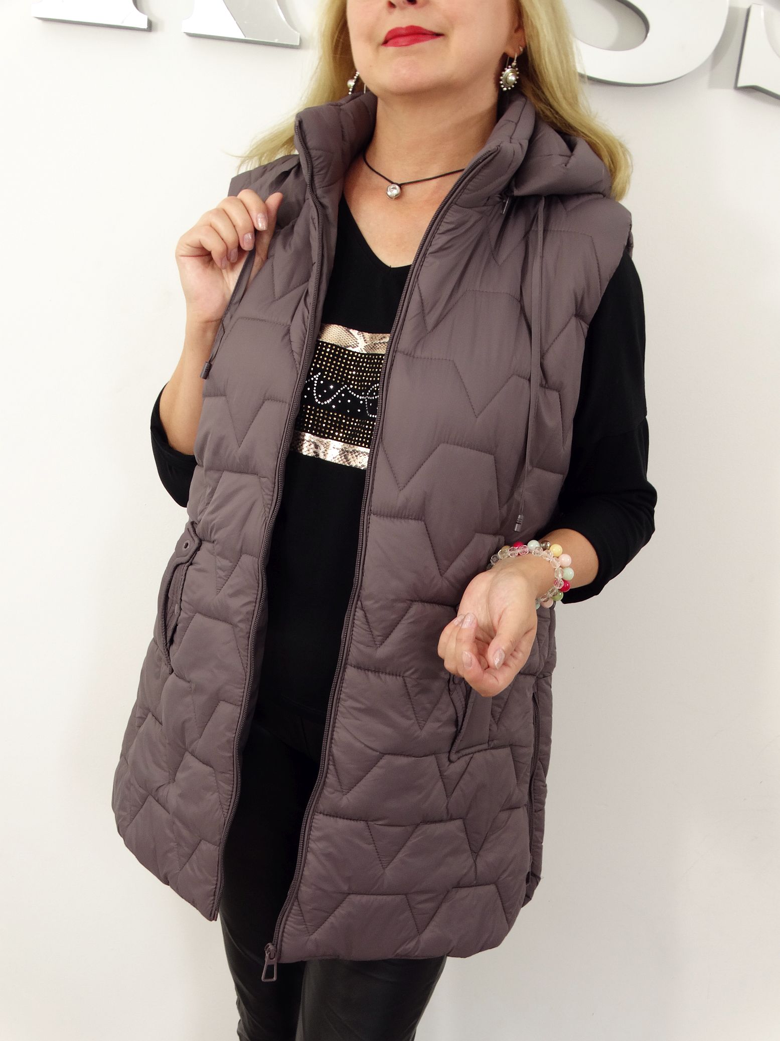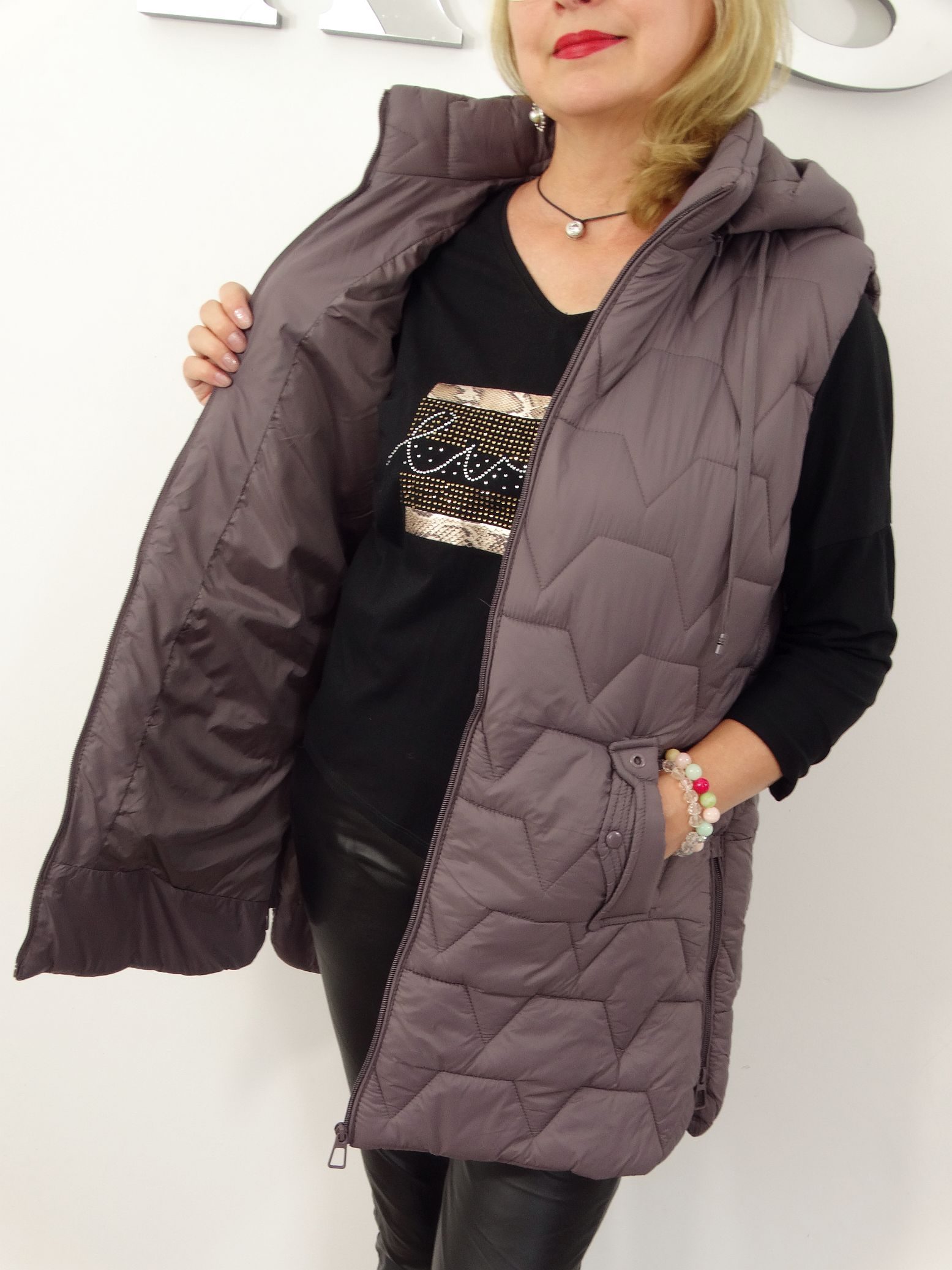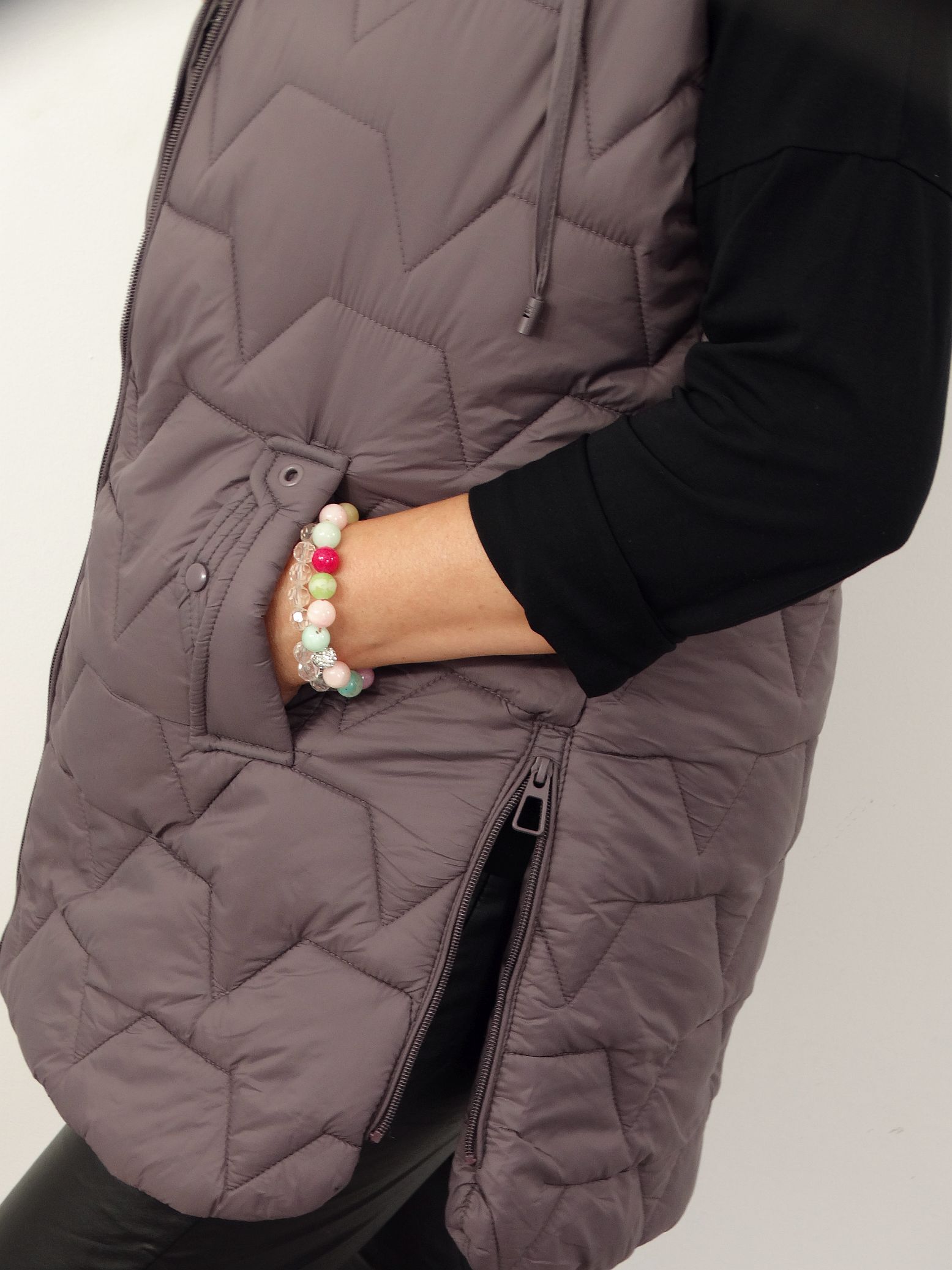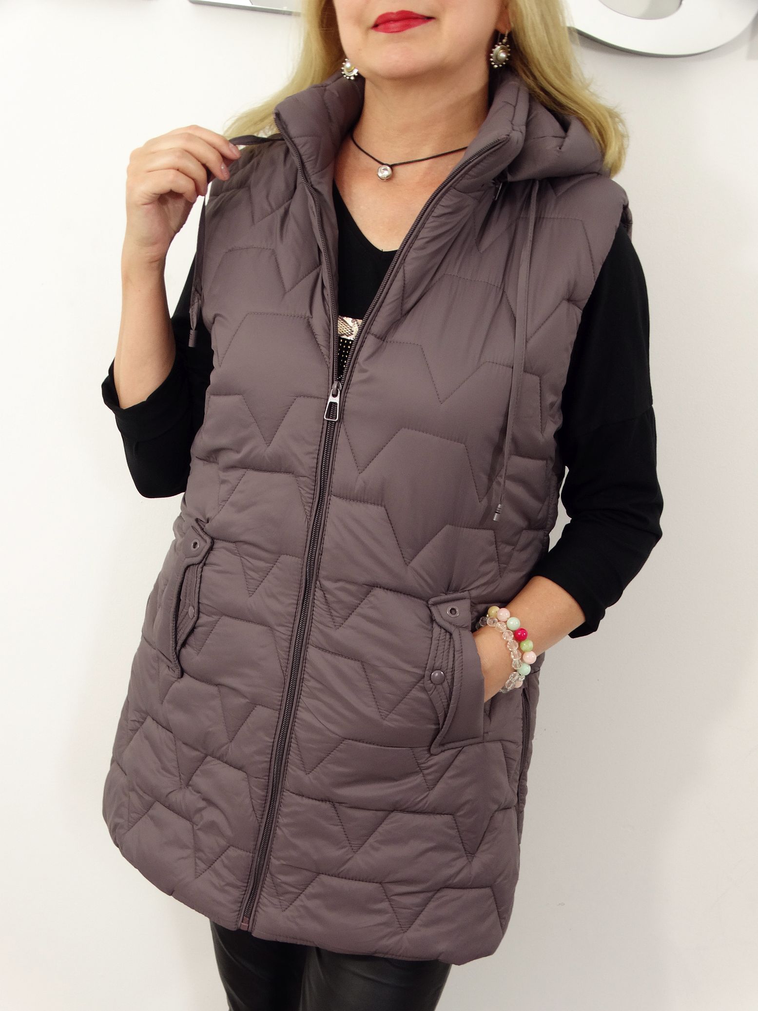 • Pikowana kamizelka z odpinanym kapturem.