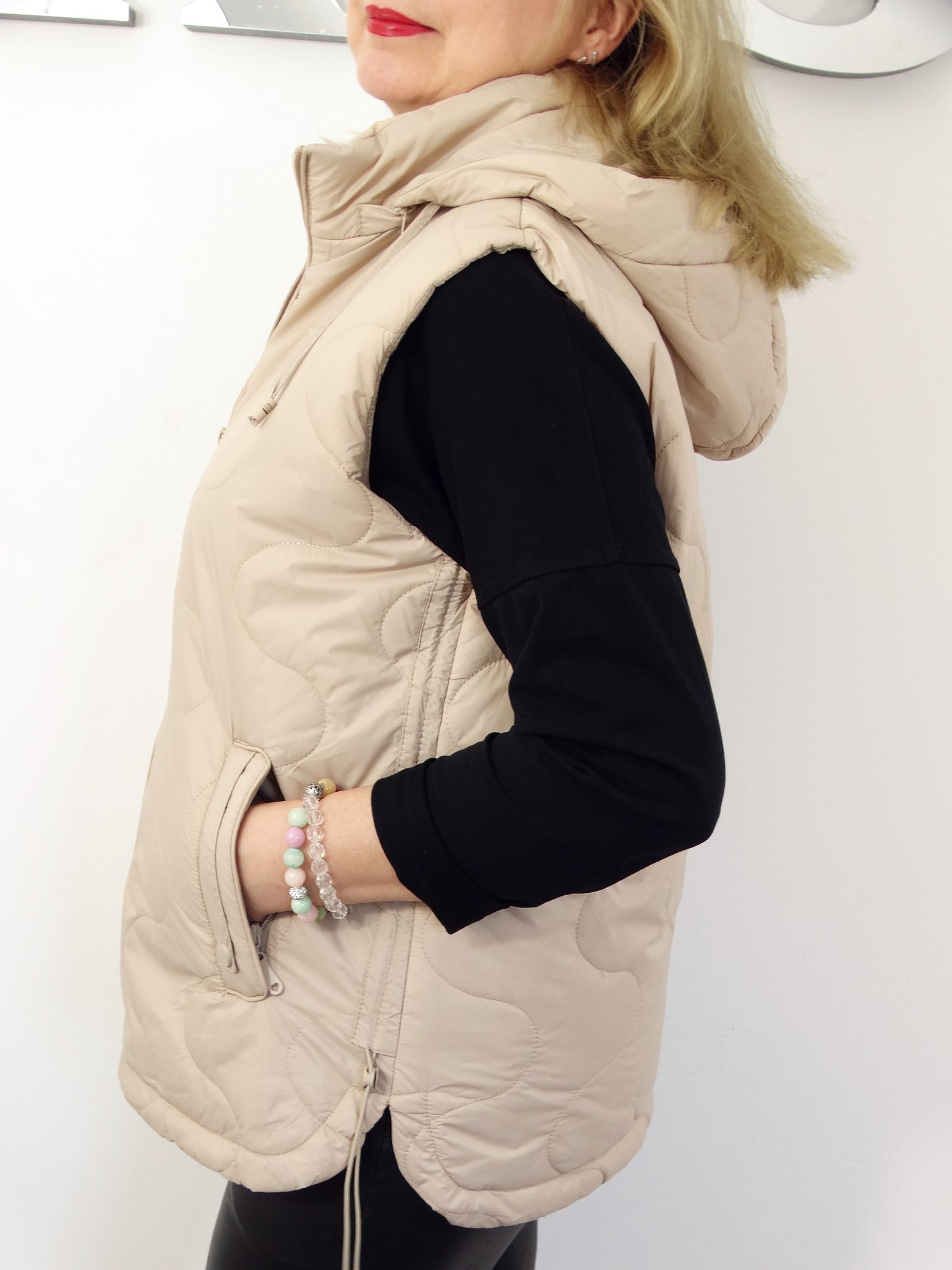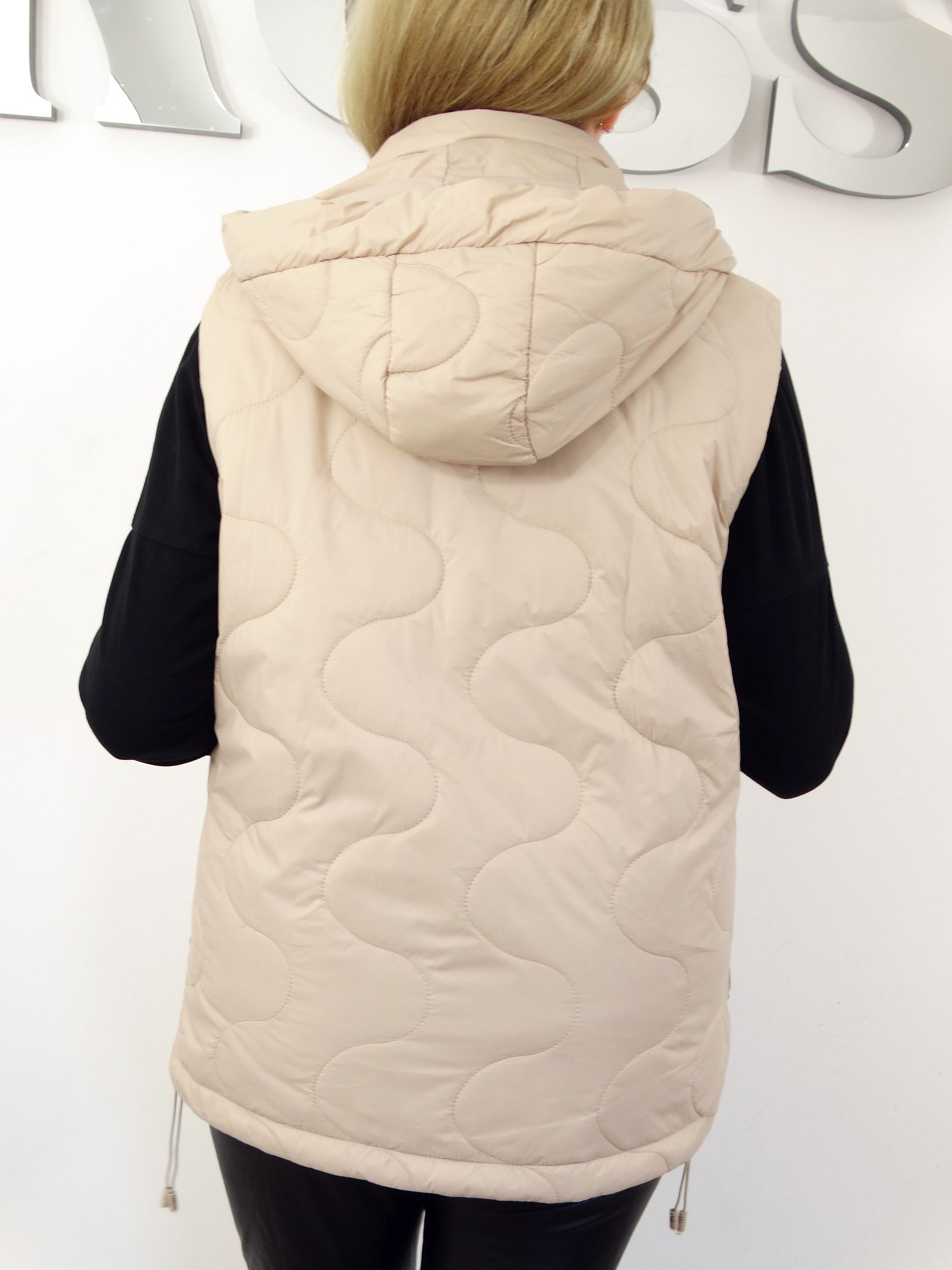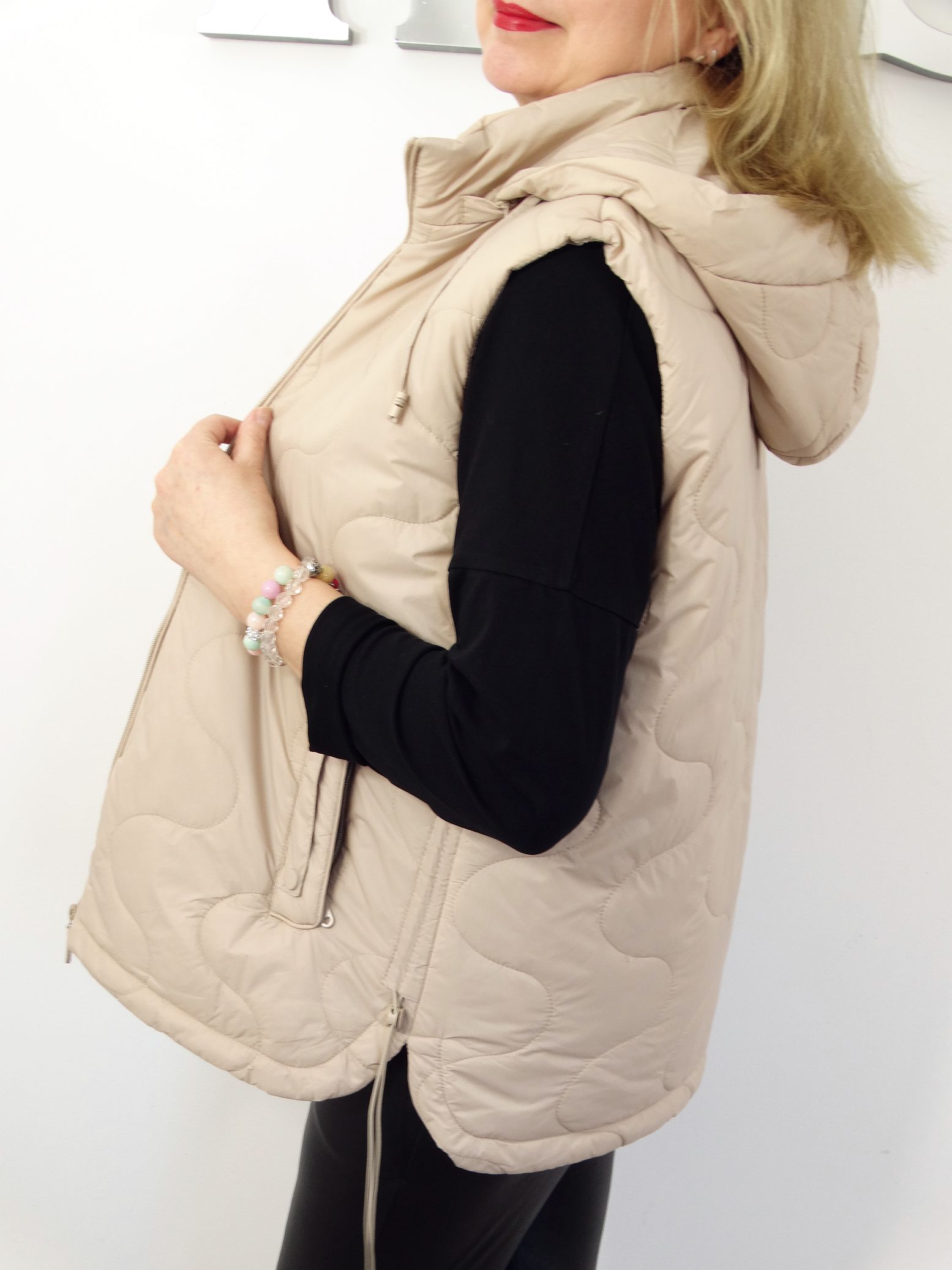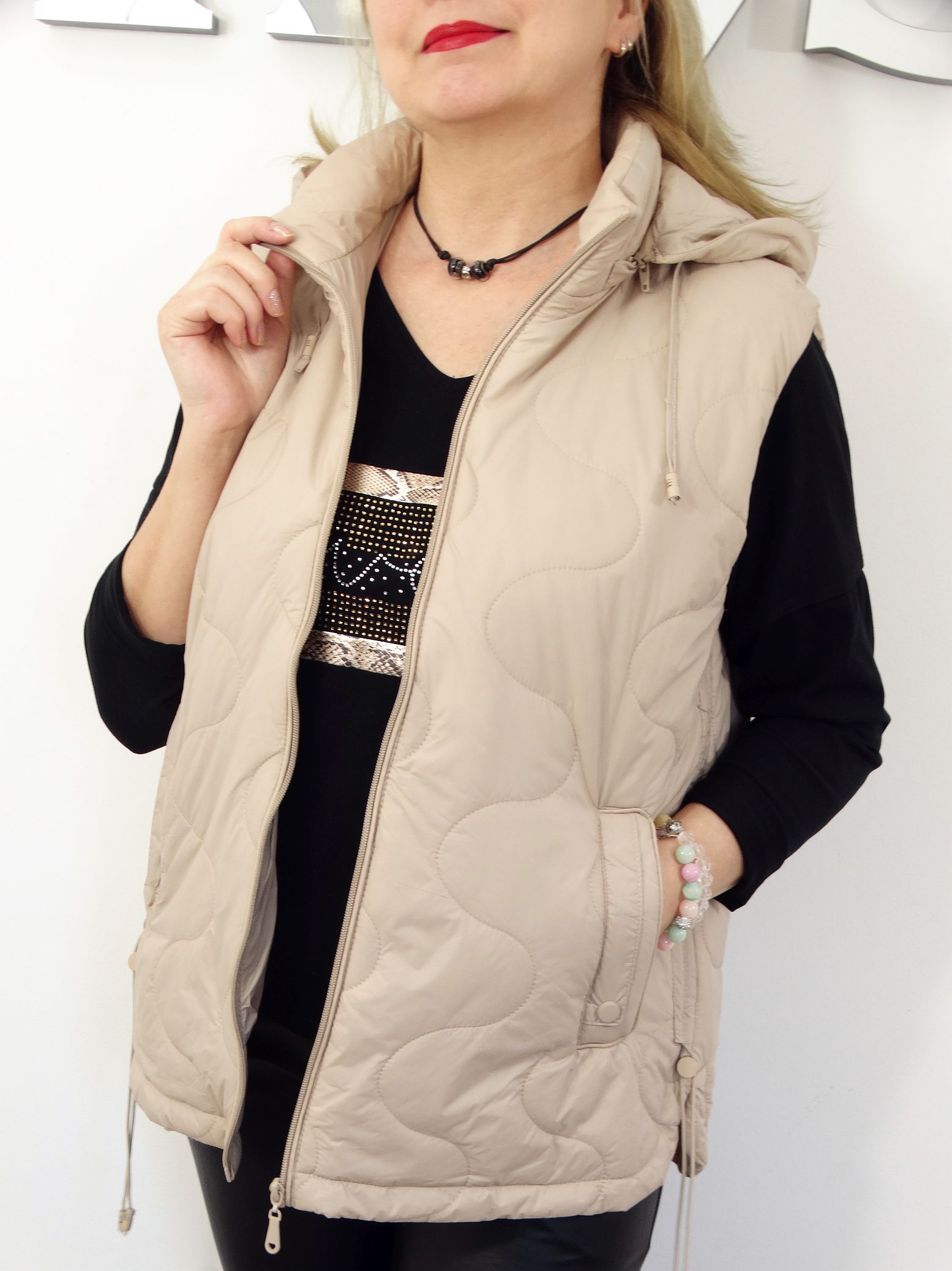 • Pikowana kamizelka z odpinanym kapturem.