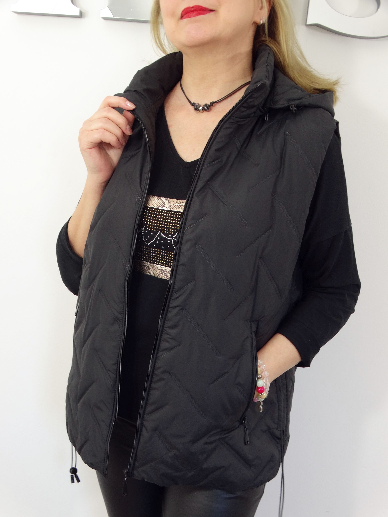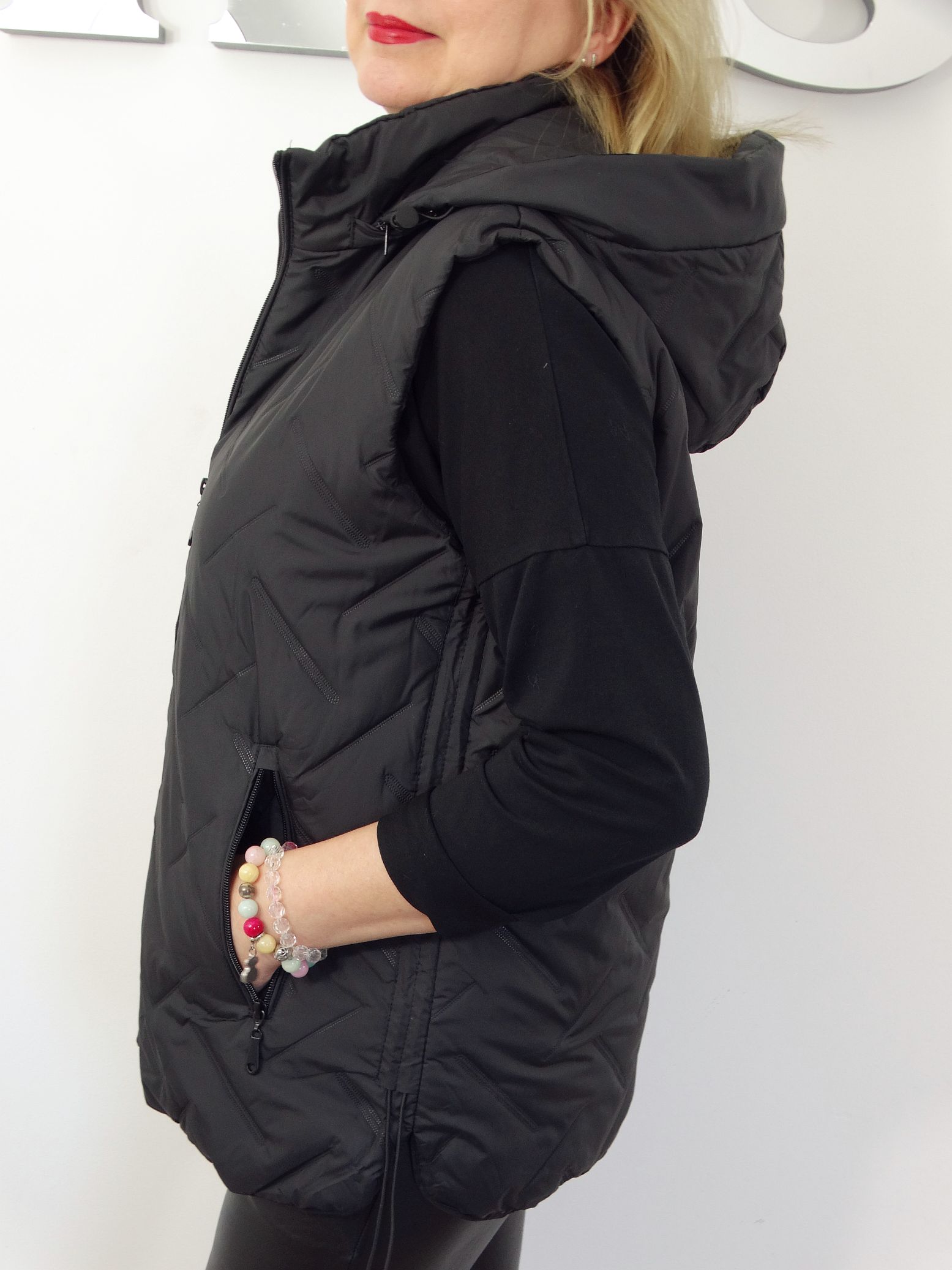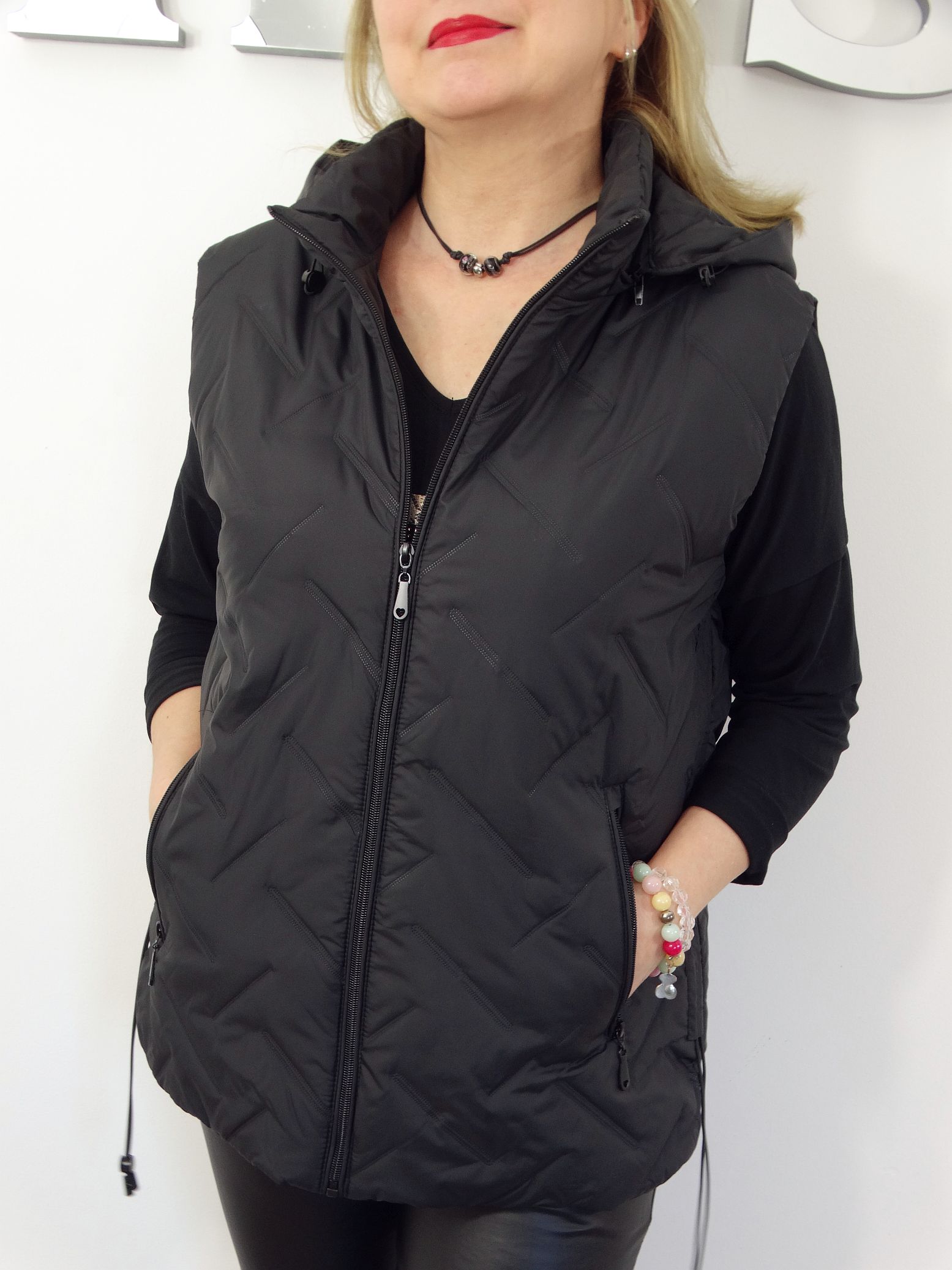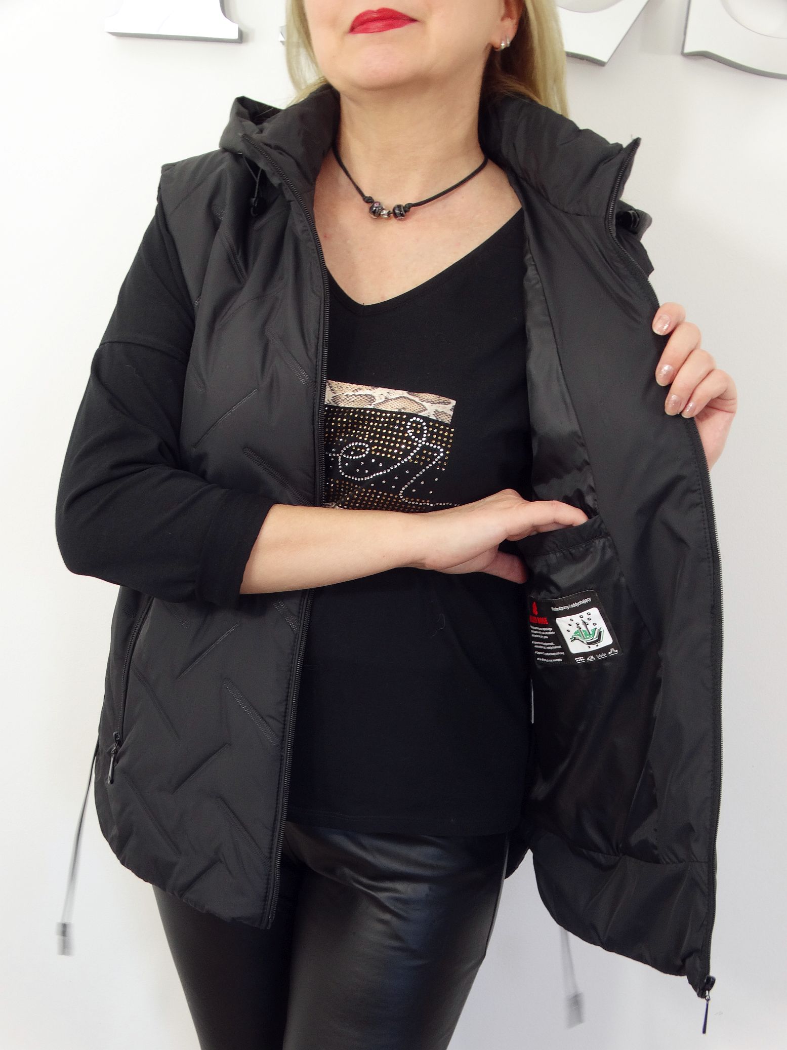 • Pikowana kamizelka z odpinanym kapturem.