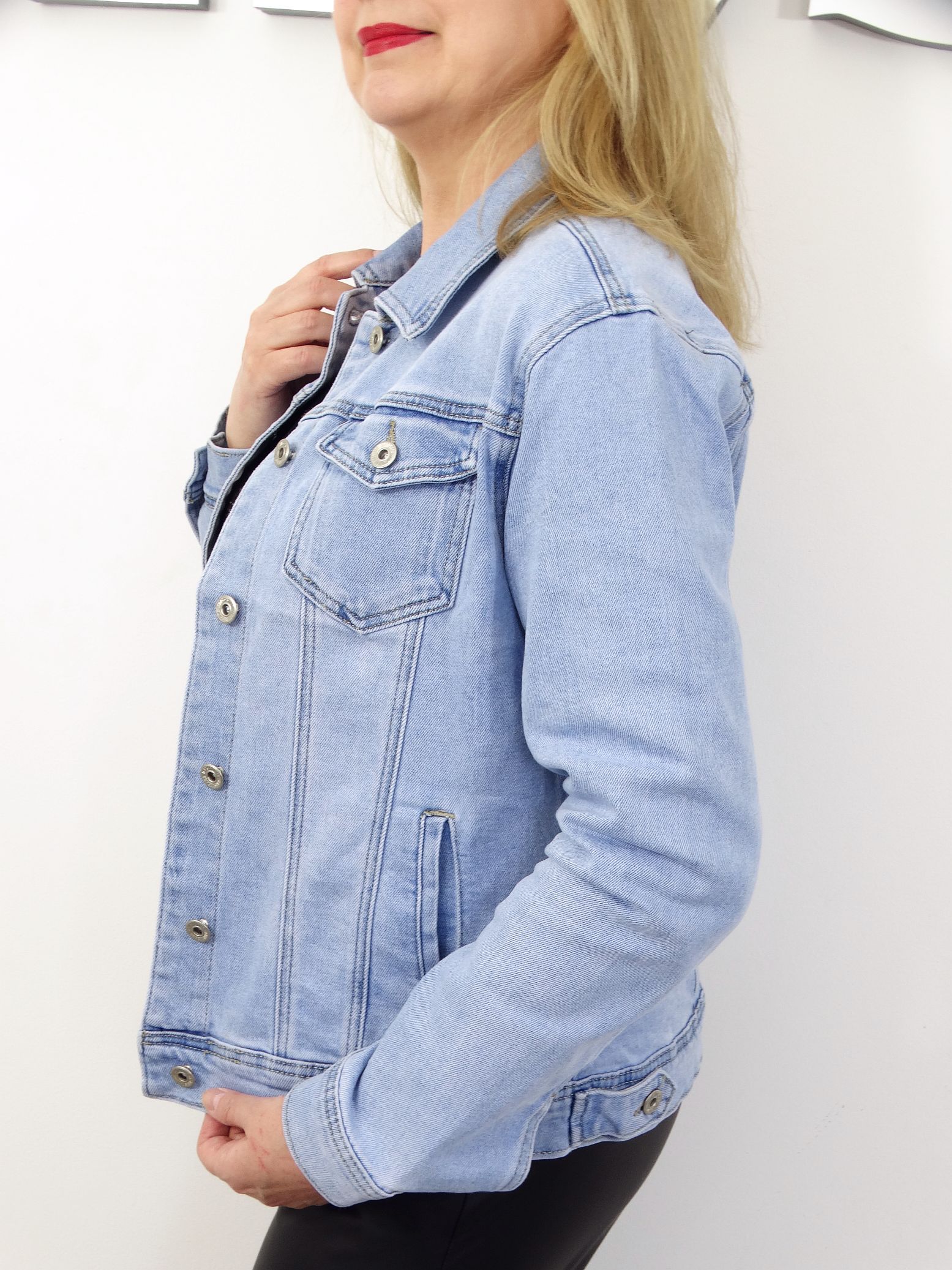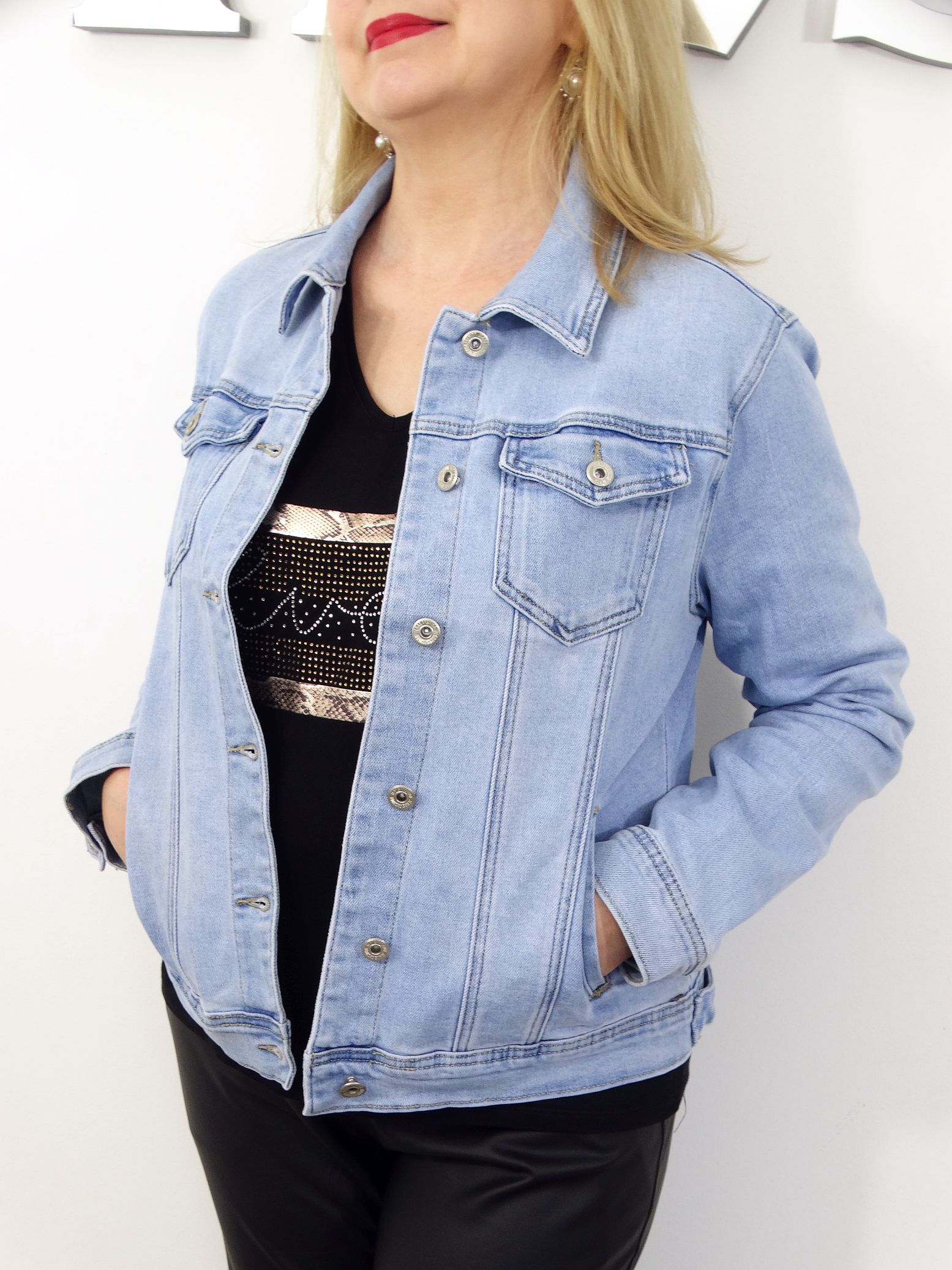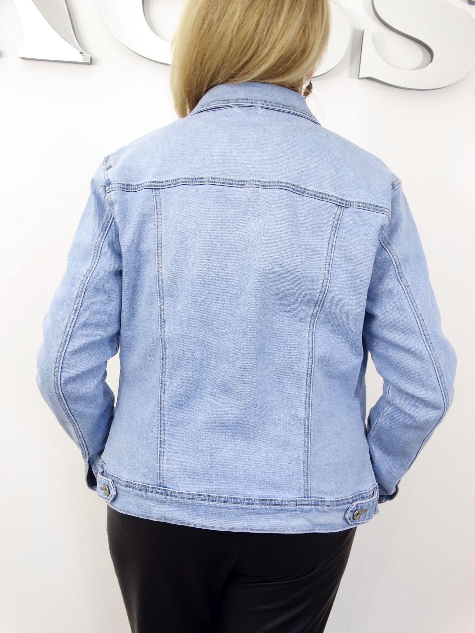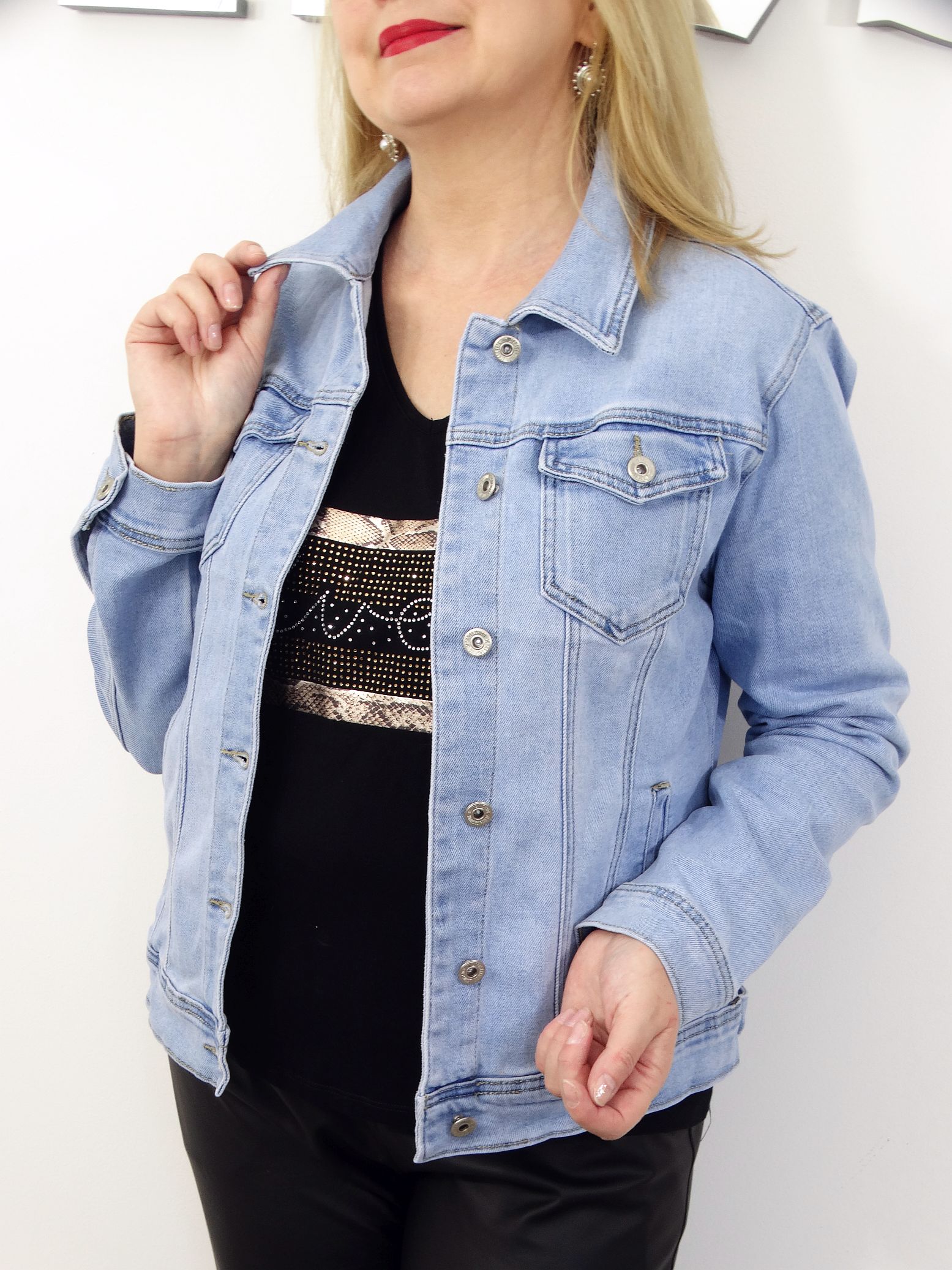 - Modna, jeansowa kurtka, katana w błękitnym kolorze.