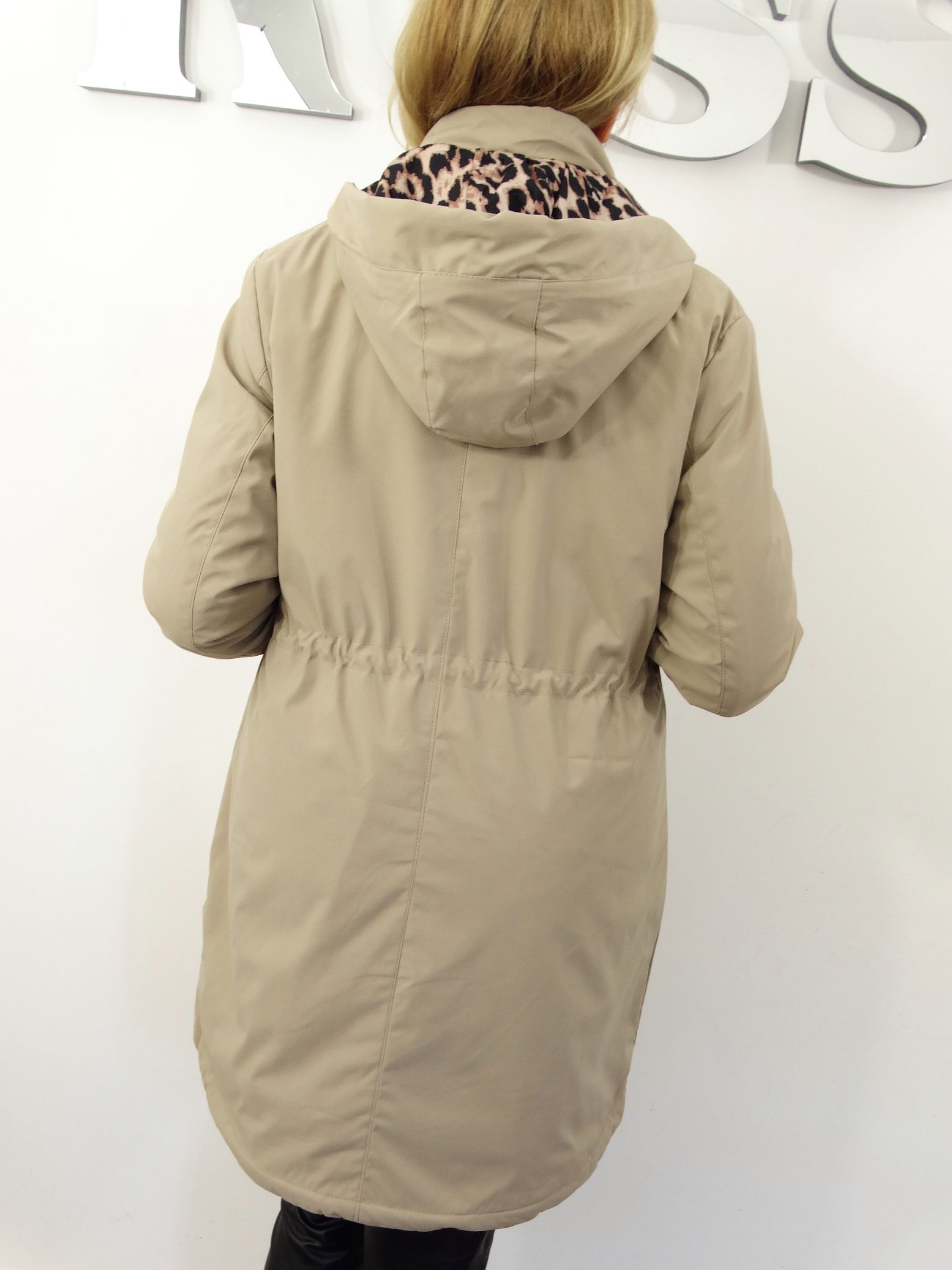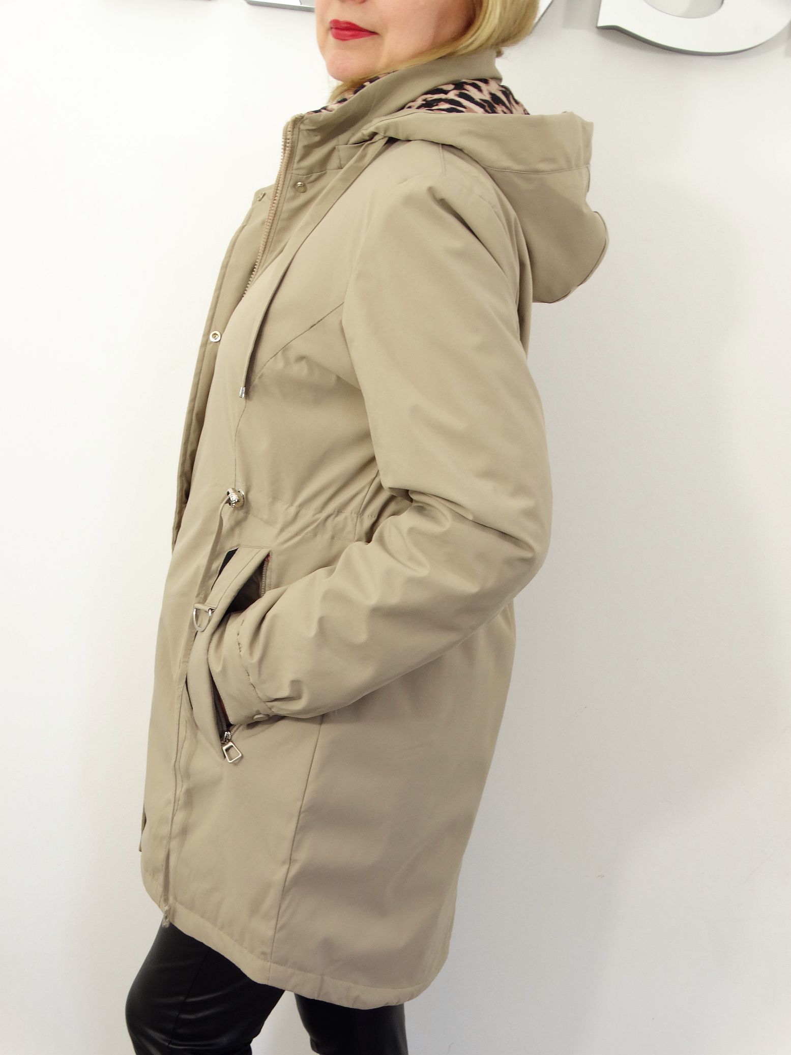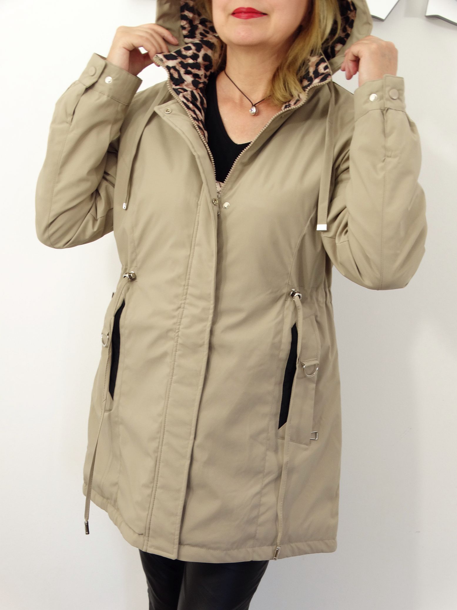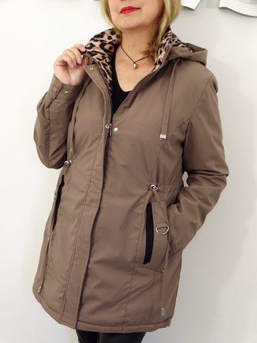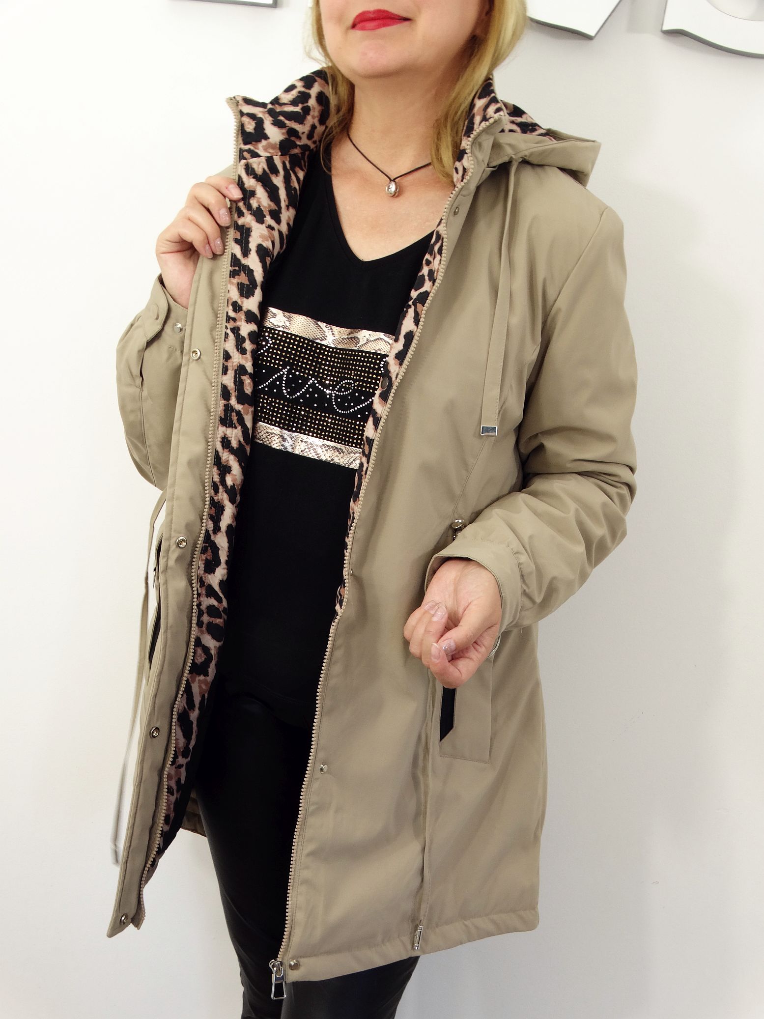 - Kurtka posiada od wewnątrz dekoracyjny motyw panterki.