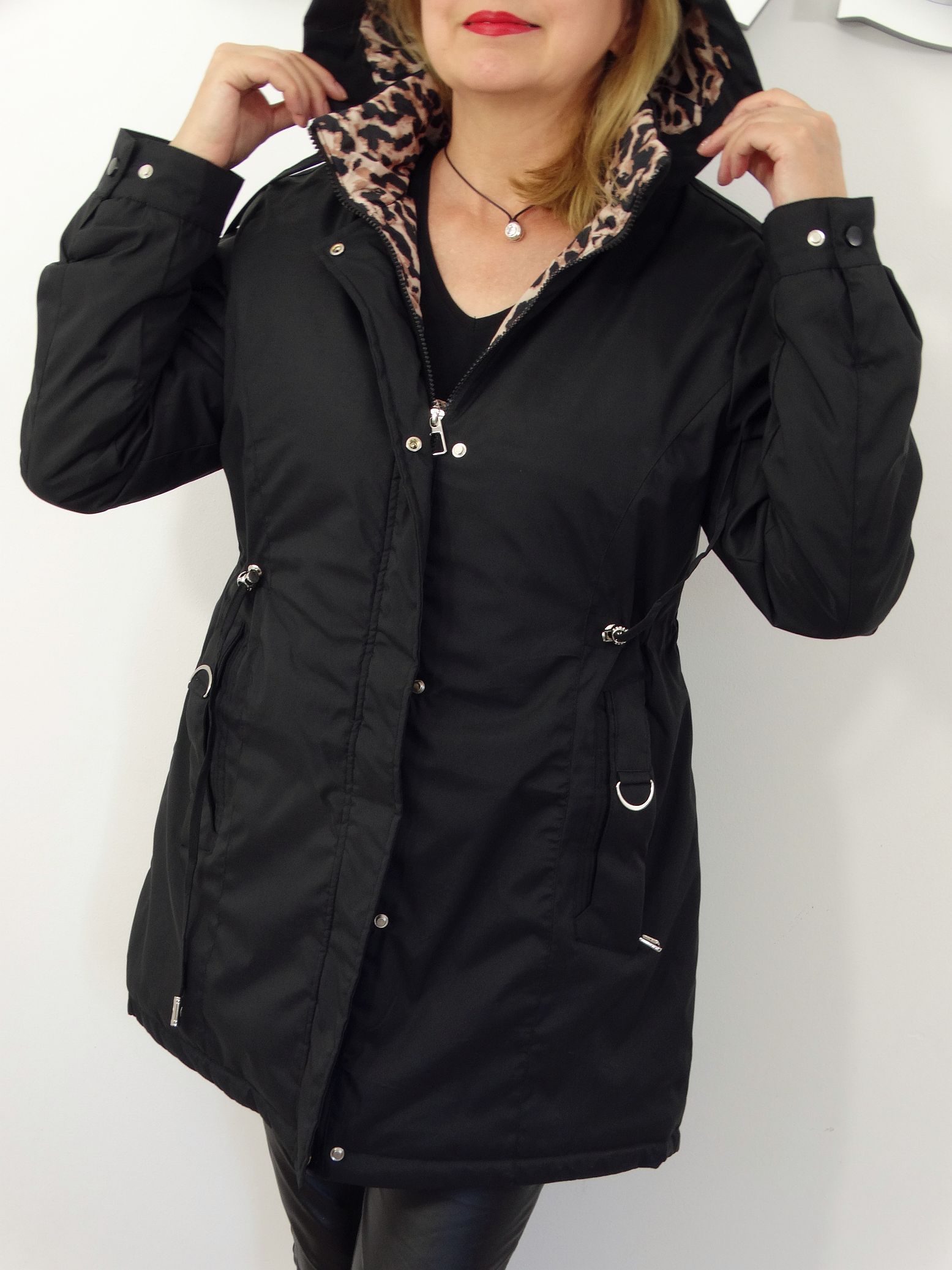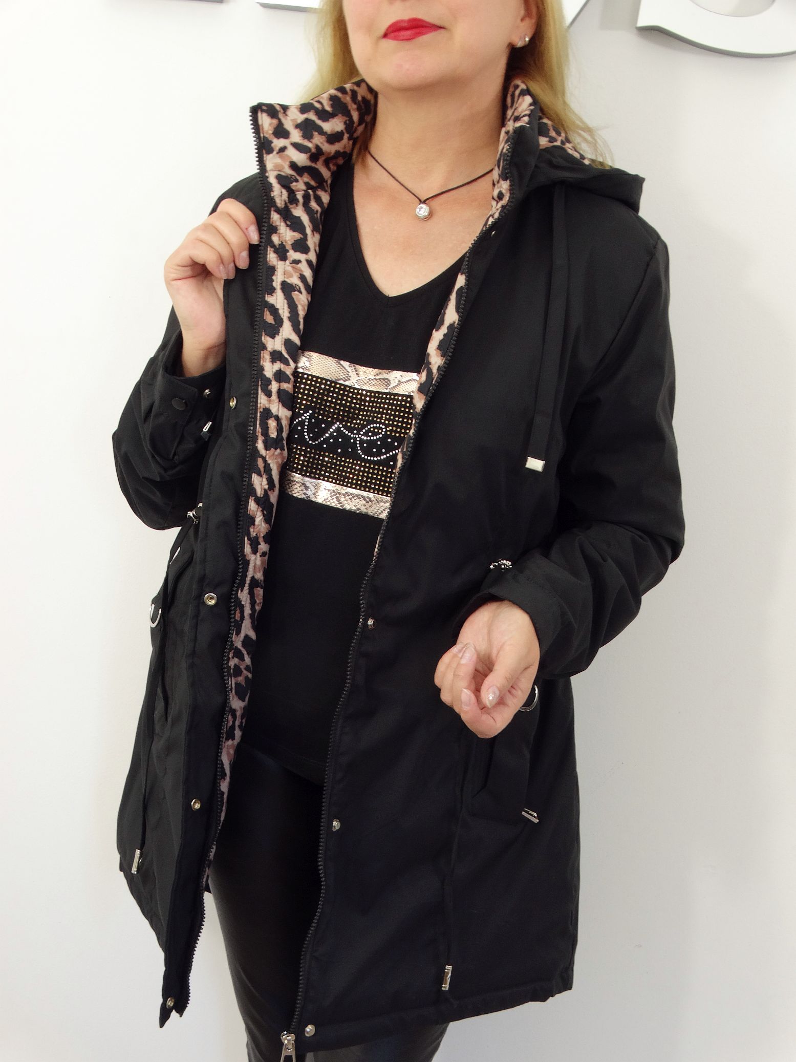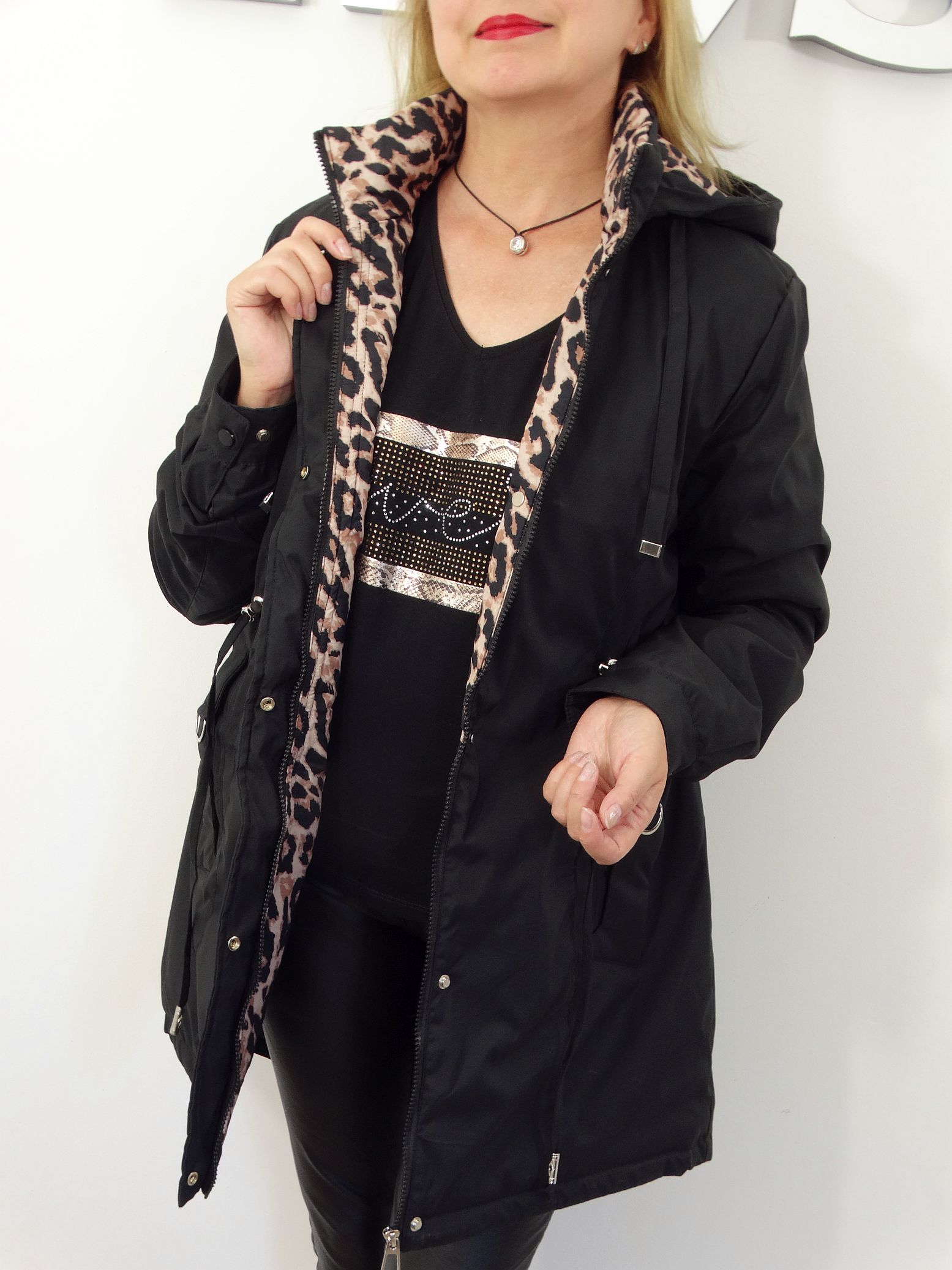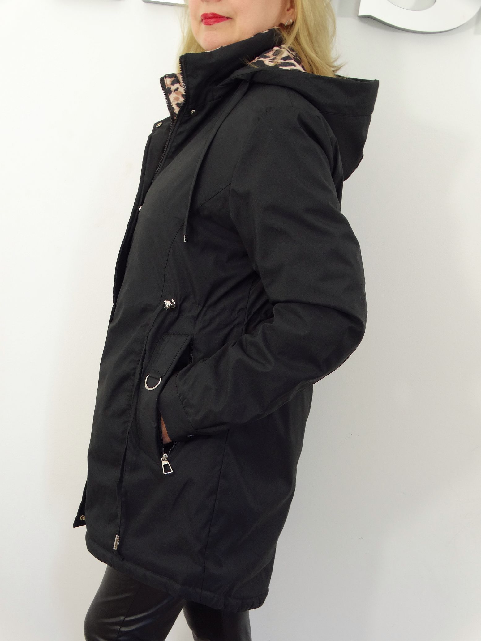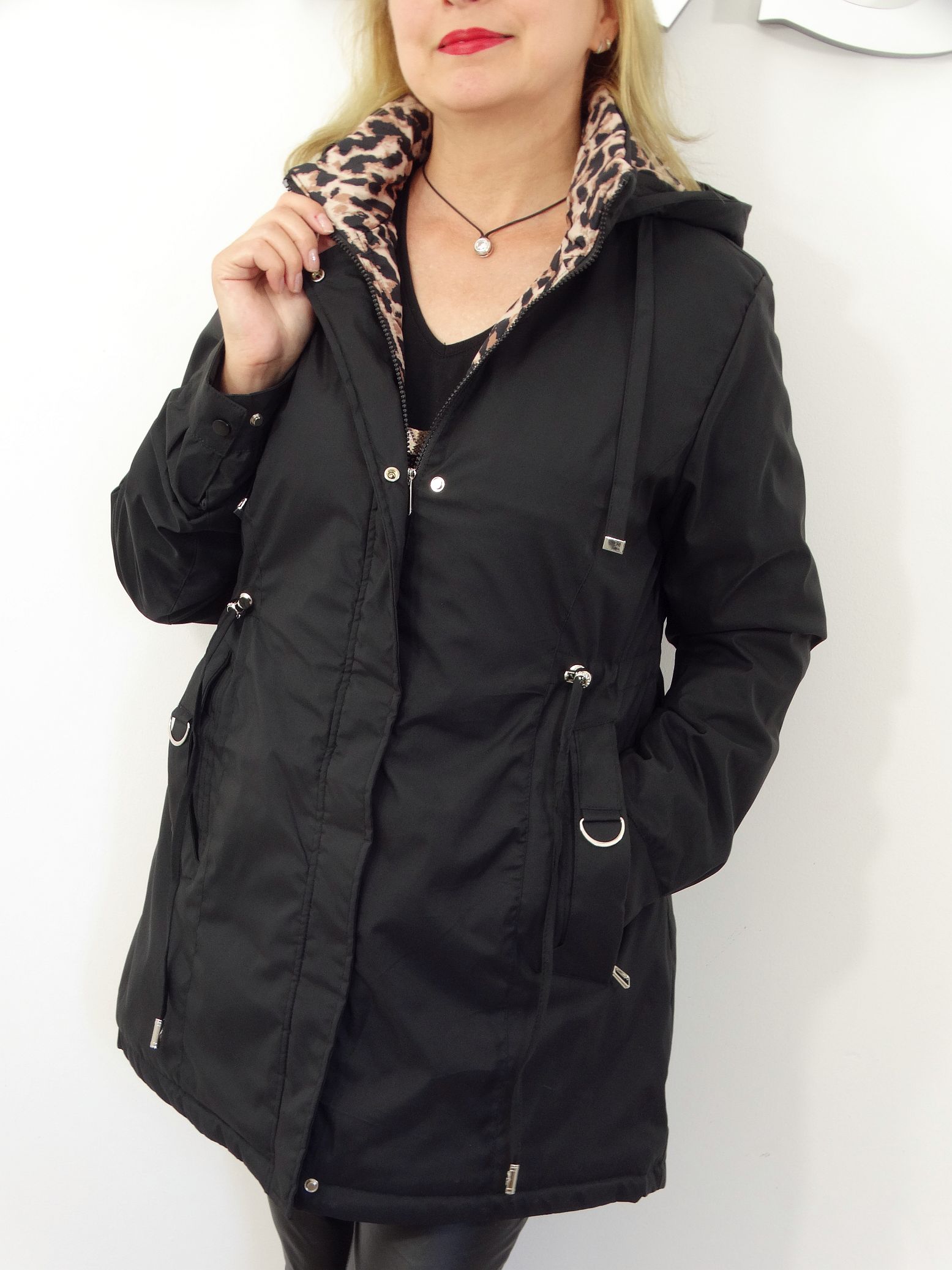 • Kurtka posiada od wewnątrz dekoracyjny motyw panterki.