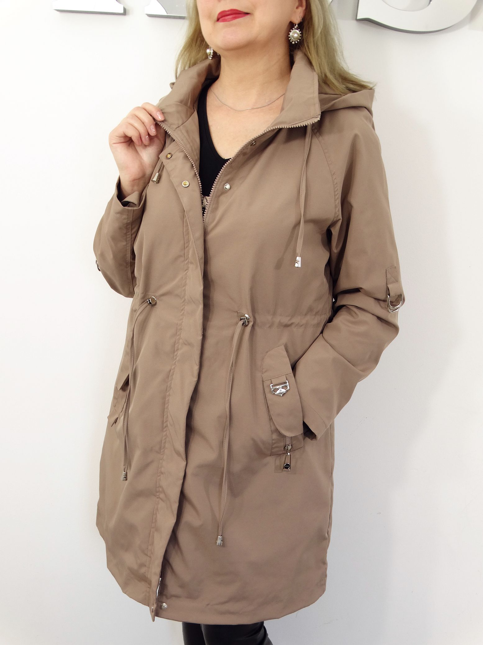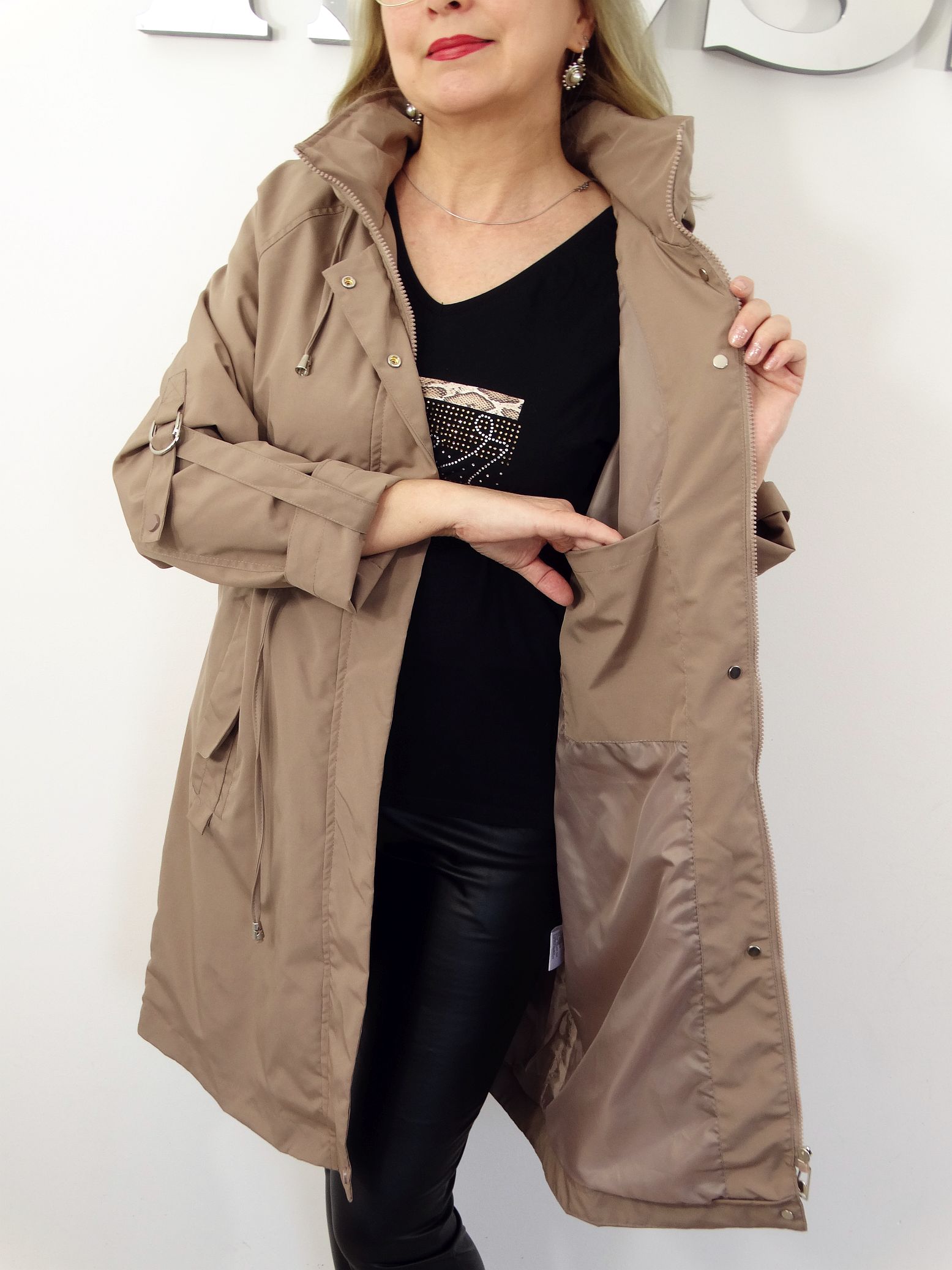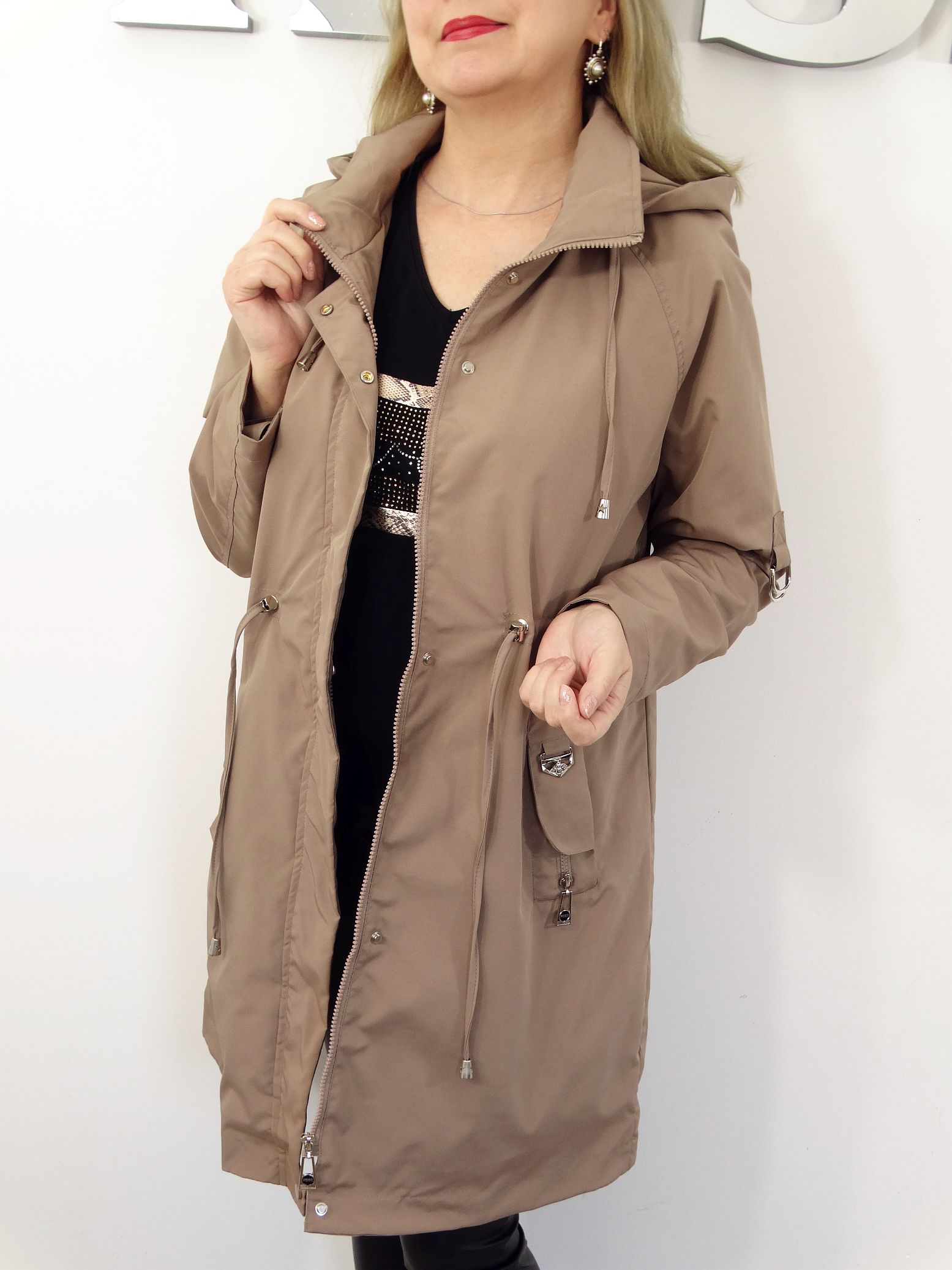 - Kieszenie płaszcza zapinane na napki.