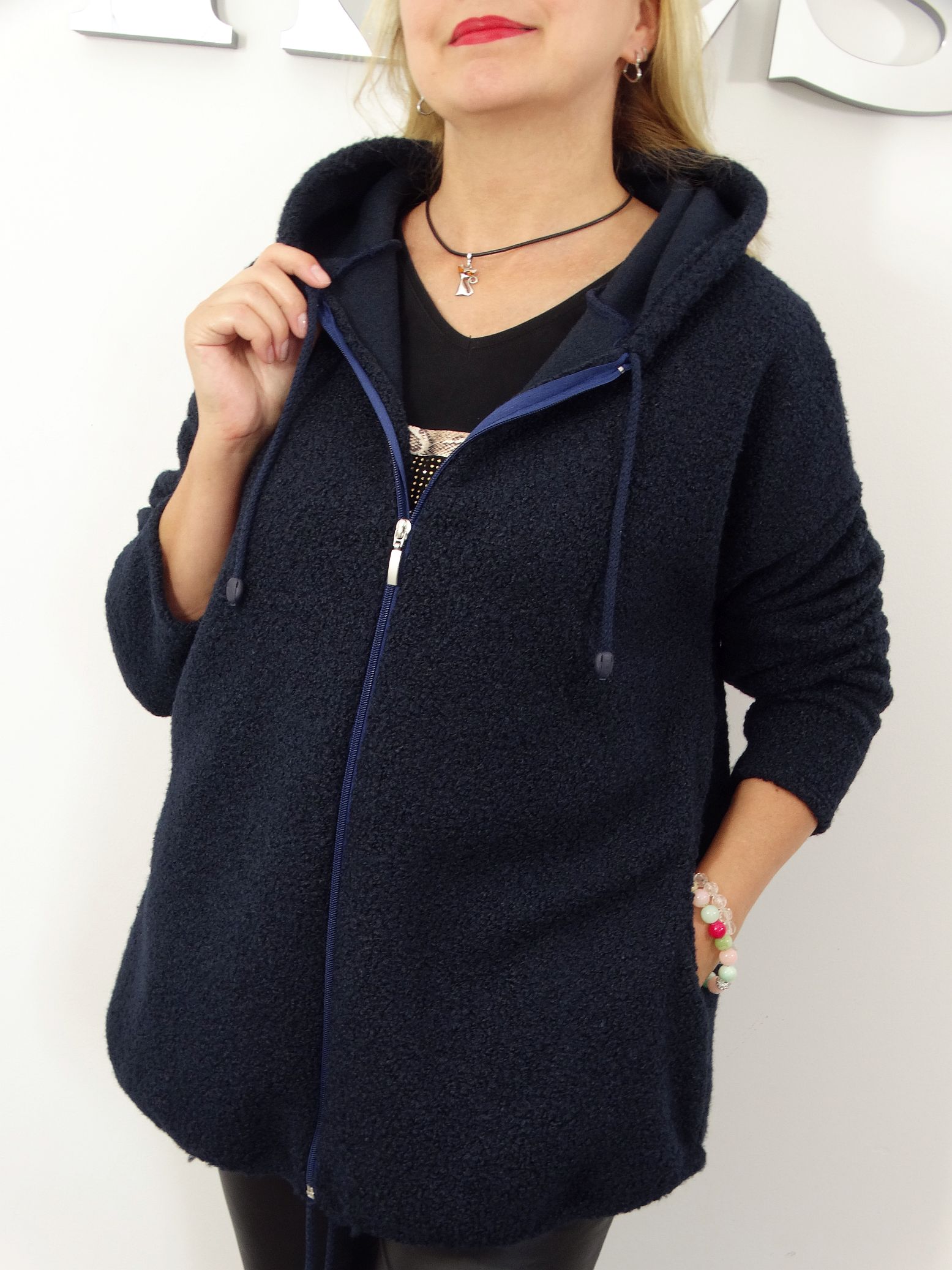 - Bluza rozpinana z kapturem i kieszeniami.